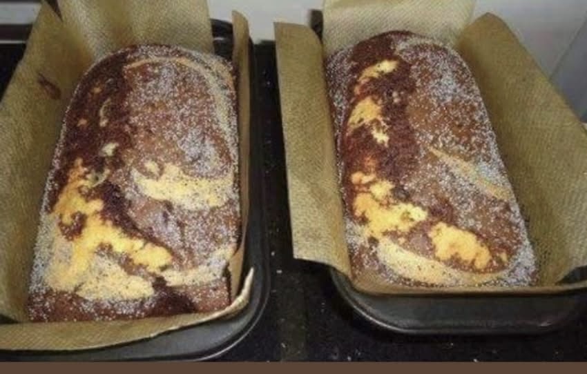 În compoziția rămasă încorporăm pudra de cacao, după care o întindem peste aluatul din tavă. Întindem aluatul cu cacao cu o furculiță, în profunzime în aluatul alb. Deasupra putem pune miez de nucă măcinat sau tocat grosier.